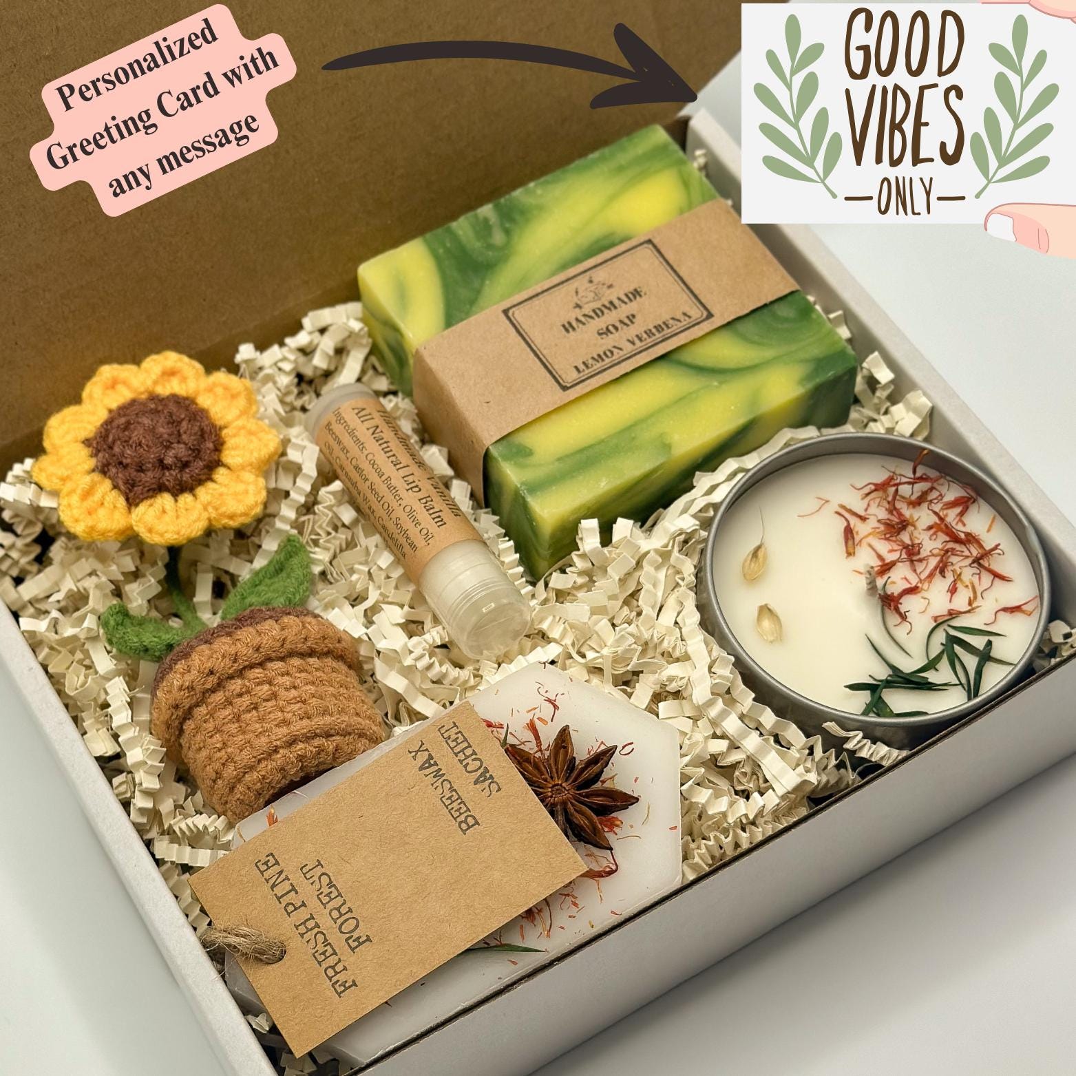 This box includes a handmade soap with a scent of your choice, a natural vanilla lip balm, a wax sachet with a fresh pine forest scent, a soy wax candle matching the scent in a 4oz silver tin jar and a crochet sunflower in a pot.