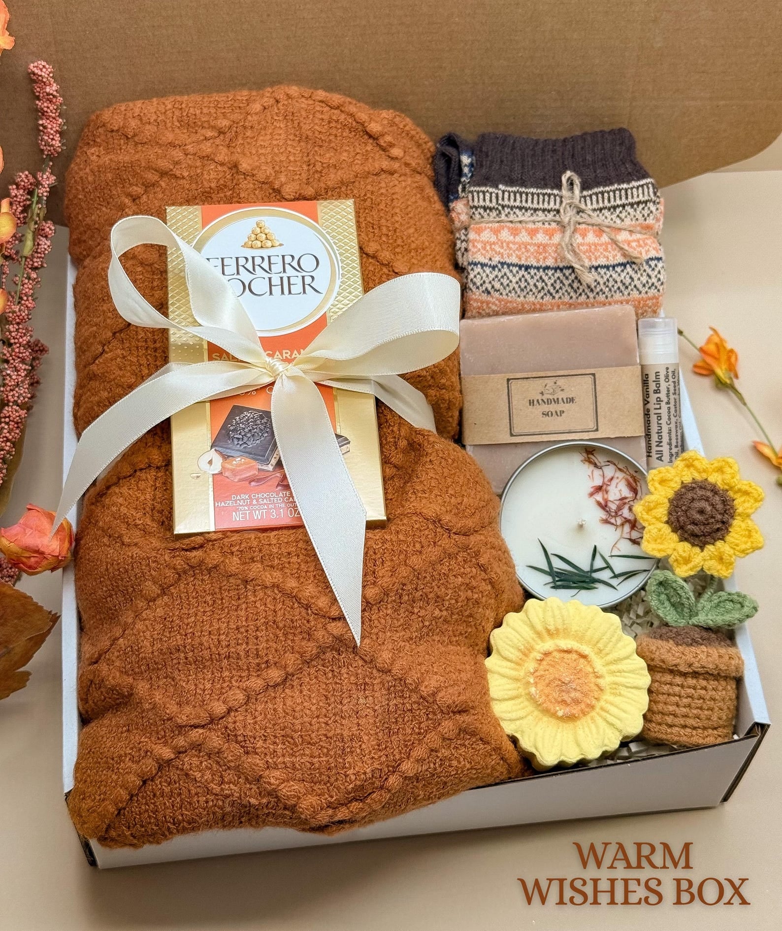 This gift box includes a good vibes fall themed tumbler, cozy blanket, soft socks, 2 cappuccino packets for a late night hot drink, crochet sunflower, vanilla handmade lip balm and a vegan leather journal.