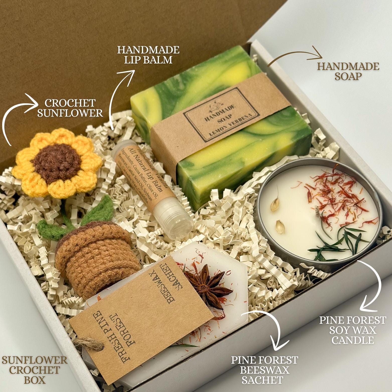 This gift box includes a custom tumbler(Please put a name in the personalization section) with a cute ghost, a cozy blanket, sunflower crochet, soft socks, a hand poured soy wax pine forest scented candle and beeswax sachet, a handmade vanilla lip balm and a vegan leather journal.