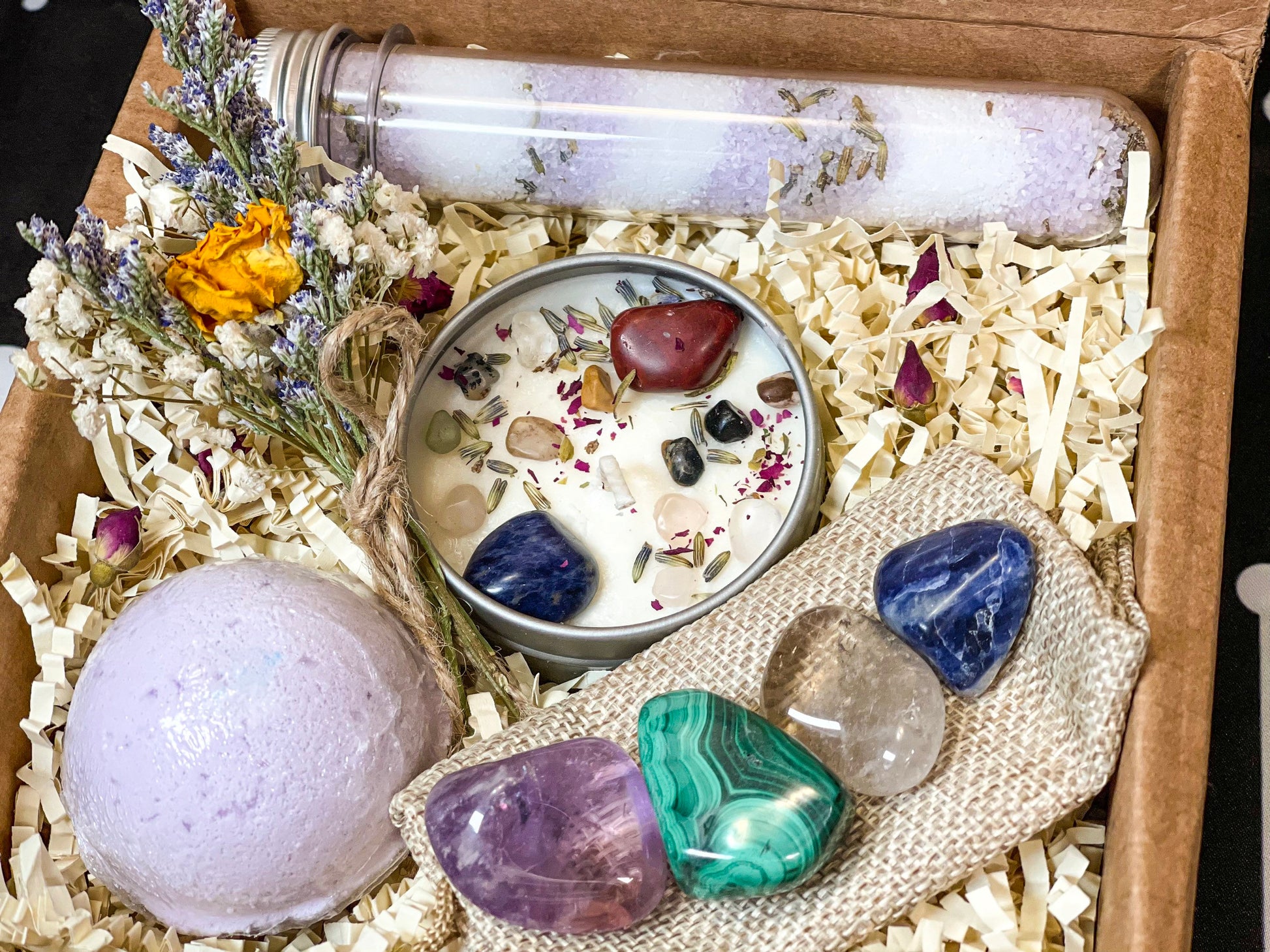 Sagittarius Crystal Set includes four tumbled crystals picked just for a Sagittarius, a Lavender 4oz candle, Lavender Bath Salt and bath bomb set and dried flowers with a crystals sticker card.